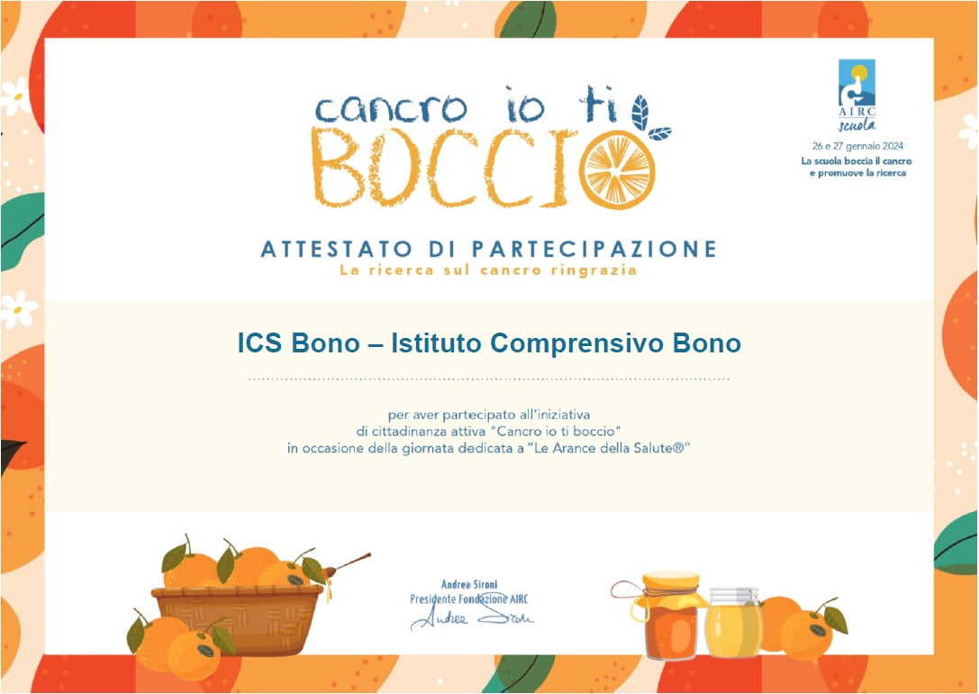 AIRC nelle scuole accompagna l’Istituto Comprensivo Bono, anche quest’anno, con un laboratorio di cittadinanza attiva e volontariato con l’iniziativa “Cancro io ti boccio ″.